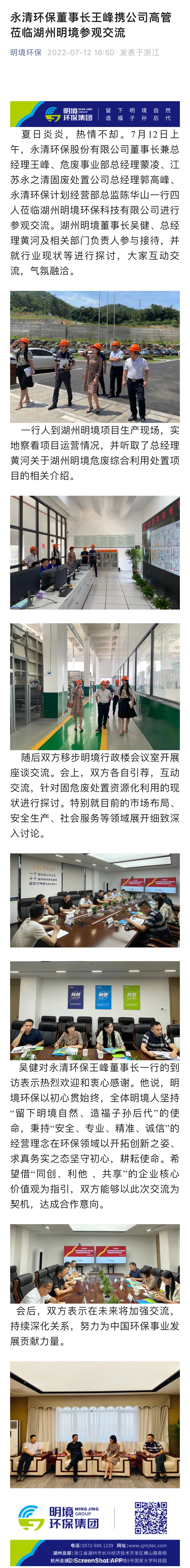 永清環保董事長王峰攜公司高管 蒞臨湖州明境參觀交流